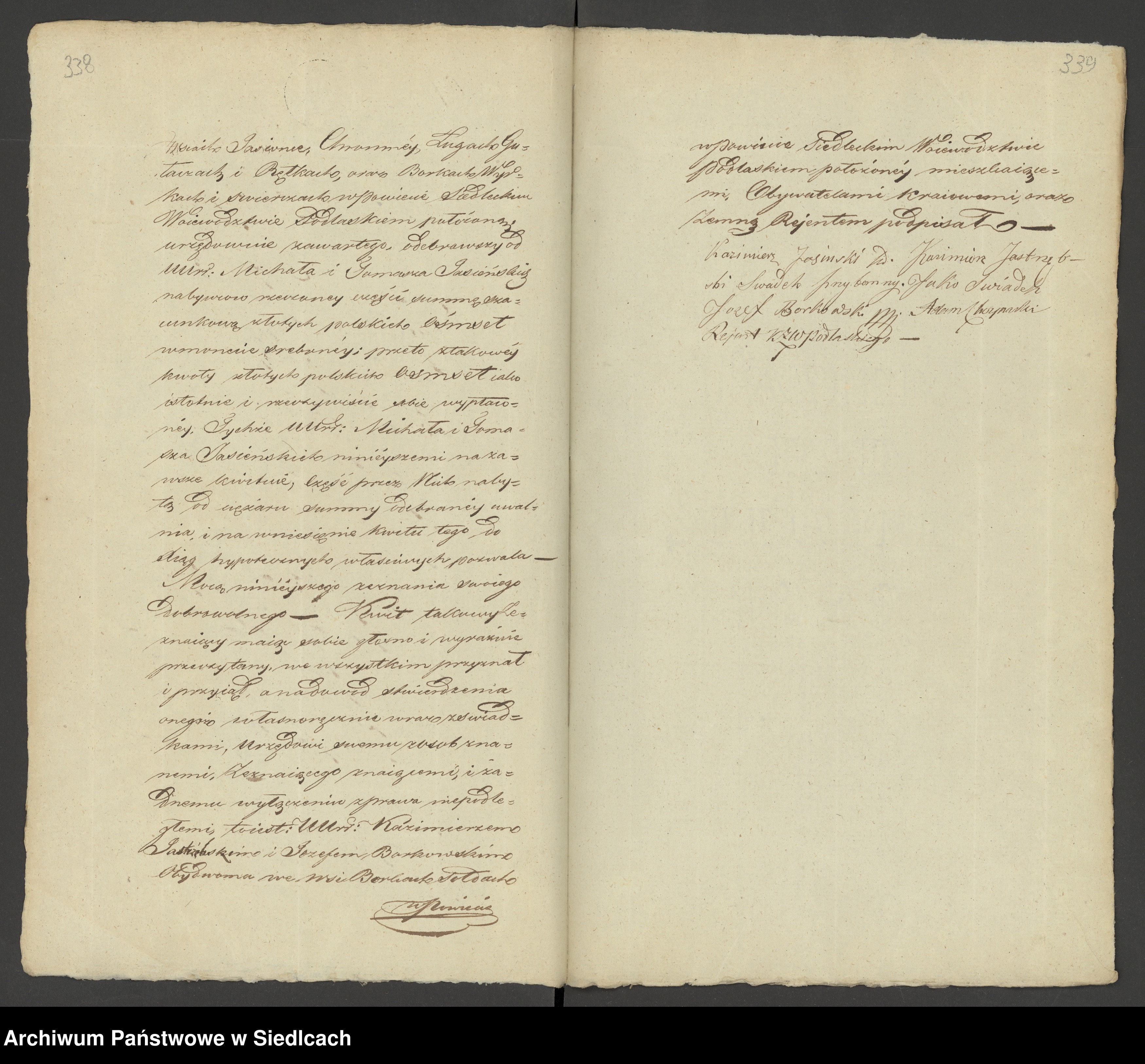 Testament ten został włączony do akt notariusza Augustyna Szczawińskiego z Siedlec dnia 1.05.1830 r. (wpisy notariusza Szczawińskiego z tego okresu znajdują się w Archiwum Państwowym w Siedlcach).