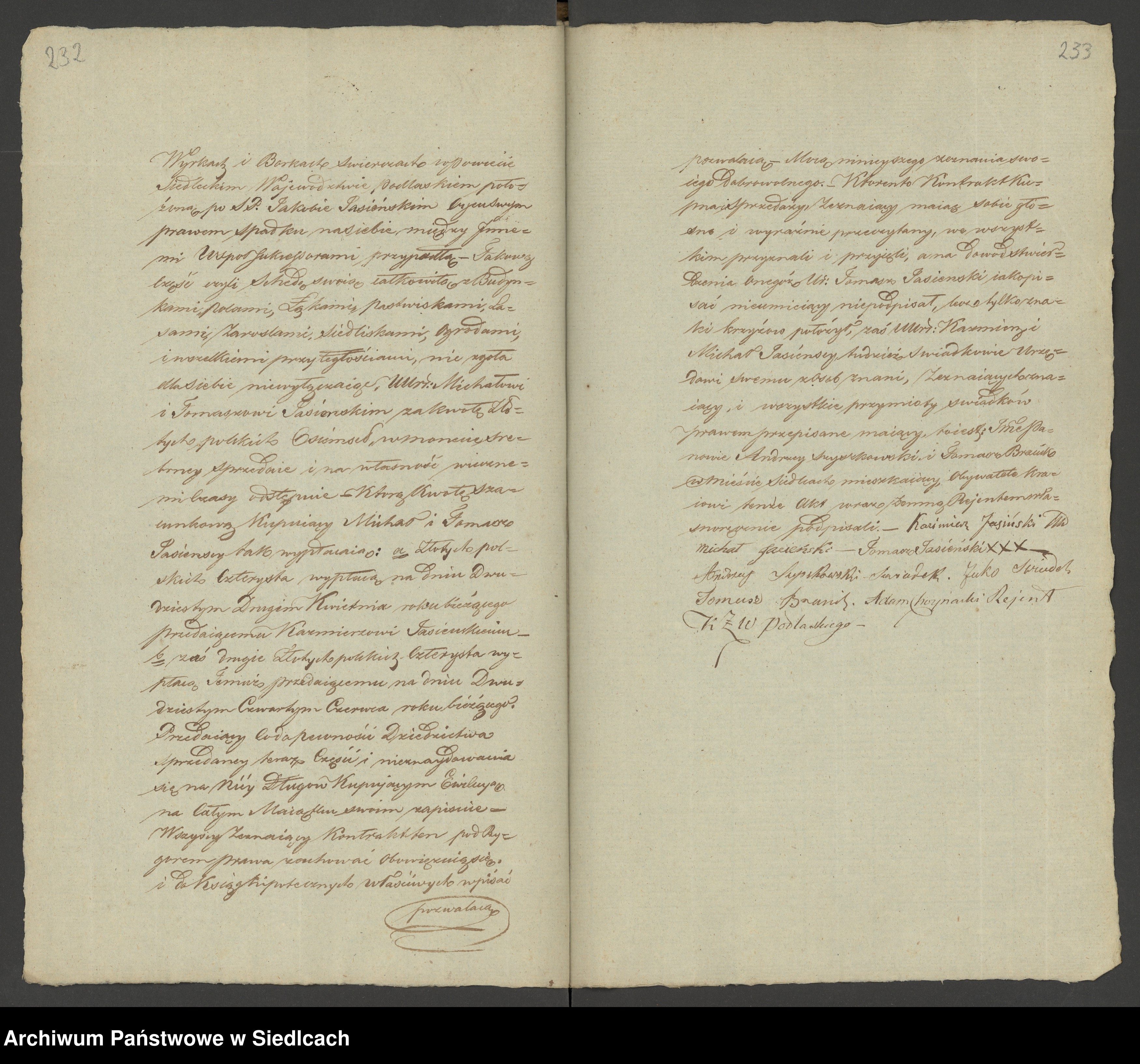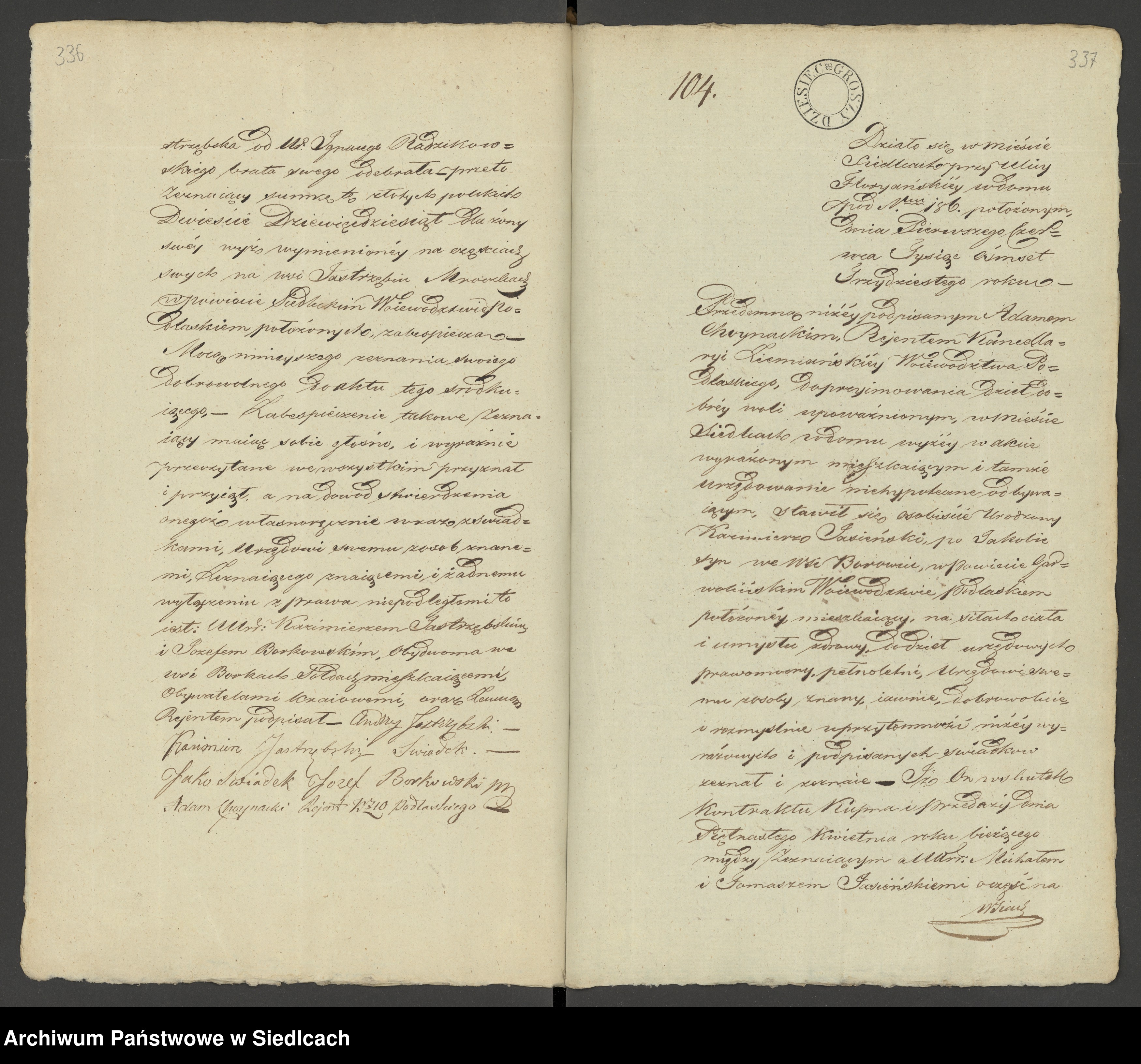 Testament ten został włączony do akt notariusza Augustyna Szczawińskiego z Siedlec dnia 1.05.1830 r. (wpisy notariusza Szczawińskiego z tego okresu znajdują się w Archiwum Państwowym w Siedlcach).