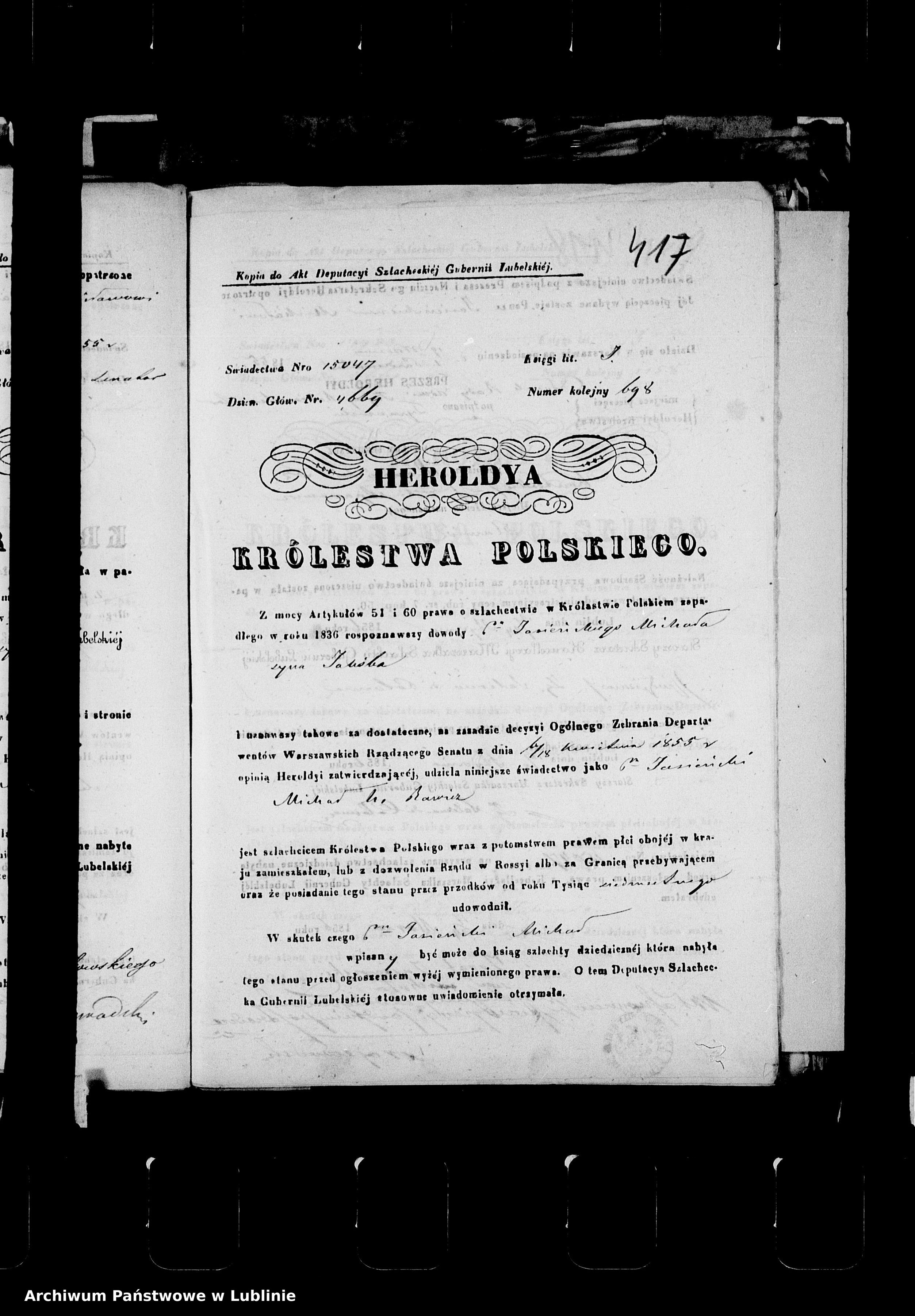 Michał legitymował się ze szlachectwa przed Heroldią KP herbem Rawicz w roku 1855, dyplom z legitymacją odbiera (skan 1, skan 2), już po śmierci Michała, jego syn Józef Aleksander UR 1828[niewymieniony w powyższym drzewie]. Żoną Józefa Aleksandra była Paulina Marianna Chojecka UR 1834. Ich ślub miał miejsce w roku 1851 w Zbuczynie. Mieli 7 synów. Rodzina ta mieszkała we wsi Tarcze, z której pochodziła Paulina. ;